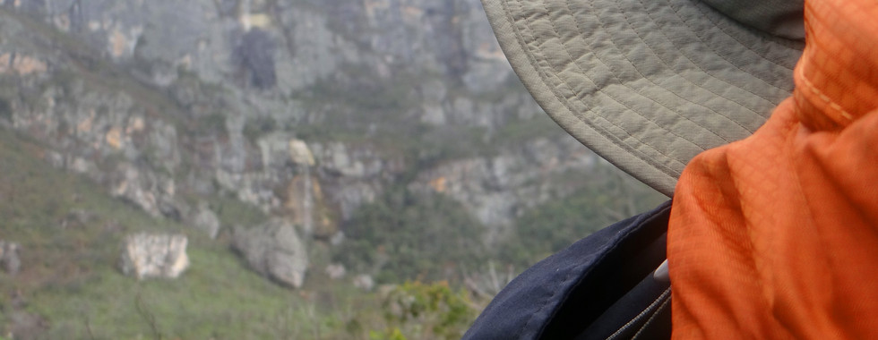 Alguns quilômetros à frente, driblamos um curral e damos de encontro com o Sumidouro do Jequitinhonha Preto. Durante os pulos entre as rochas, ouvimos as águas correndo às escondidas, lá embaixo. Agora é hora de subirmos um forte morro por cerca de uma hora ininterrupta - a presença de carrapatinhos nesse trecho próximo a pastagens bastante tomado por braquiárias e matinhos salientes nos impõe borrifarmos pulfo (um tipo de talco veterinário) uma marcha forçada e contínua!